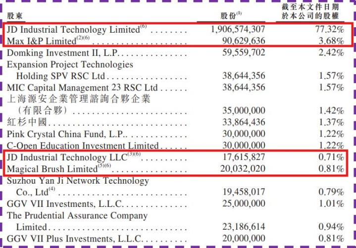 截至申请日,京东工业总股本为24.66亿股。京东集团通过3家公司间接持有京东工业19.44亿股,占总股本的78.84%;刘强东还单独通过MaxI&PLimited持有京东工业3.68%的股份,为其第二大股东。