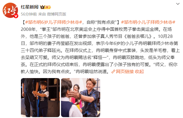 2008年,“拳王”邹市明在北京奥运会上夺得中国首枚男子拳击奥运金牌。在场外,他是三个孩子的爸爸,还曾参加亲子真人秀节目《爸爸去哪儿》。10月28日,邹市明的妻子冉莹颖在发出视频,表示今年6岁的小儿子冉明羲拜师少林寺第三十四代弟子释延光。在拜师仪式上,冉明羲身穿中式套装,头发是羊毛卷,看上去呆萌又可爱。师父为冉明羲赐法名“释恒一”,冉明羲双膝跪地,低头为师父奉茶。在正式的拜师仪式结束后,冉明羲便露出了小孩子独有的可爱。“师父,祝你教人愉快。因为我有点皮。”冉明羲坦然说道。
