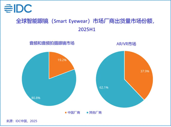 CNMO注意到,2025上半年中国智能眼镜厂商出货量突破100万台,同比增长64.2%,占据全球26.6%的市场份额。其中,在音频和音频拍摄眼镜市场,中国厂商占据全球市场19.2%的市场份额,AR/VR市场占据37.9%。