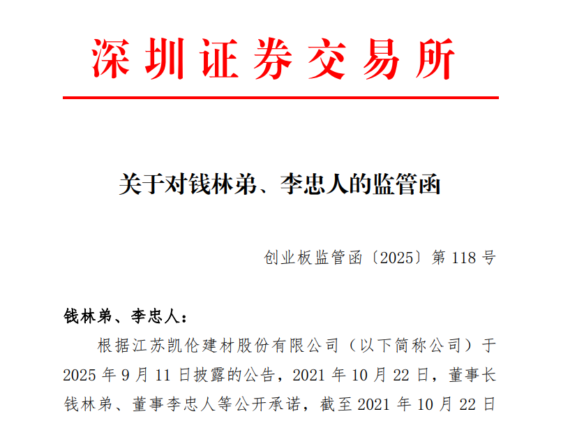 9月11日,凯伦股份(300715.SZ)董事长钱林弟、董事李忠人收到了监管函。