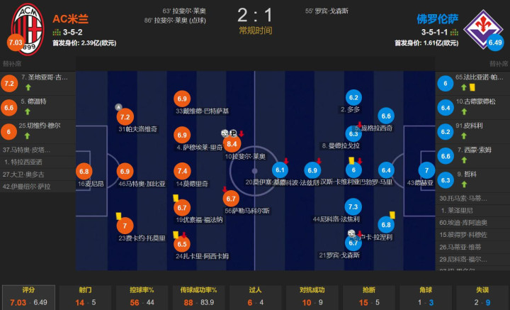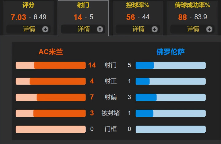 全场比赛,AC米兰的控球率为56%,一共有14次射门证星策略,其中4次射正;佛罗伦萨一共有5次射门,其中1次射正。米兰配得上胜利,逆转取胜+登顶,非常能提升士气。